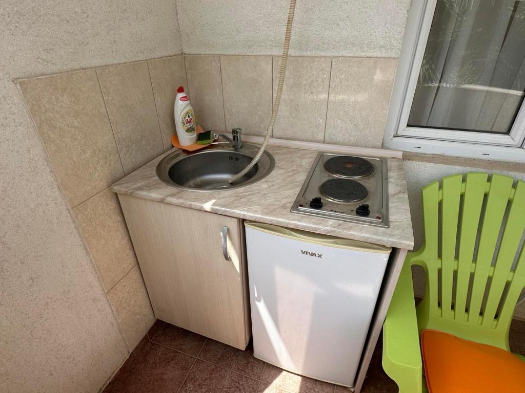 The distance from the center of Dobra Voda to the apartment is around 350 m.