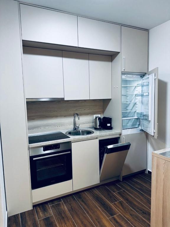 Kitchenette, Dishwasher, Washing machine, Kitchen, Electric kettle, Kitchenware, Oven, Stovetop, Dining table, Wine glasses, Coffee machine